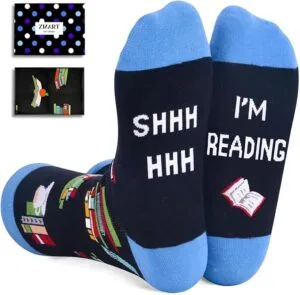 T-shirts or socks with quotes from their favorite authors. See these ‘shhhhhh i’m reading’ socks.